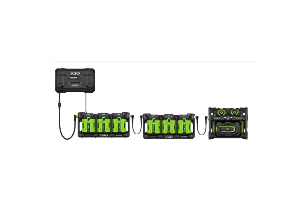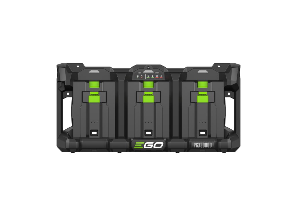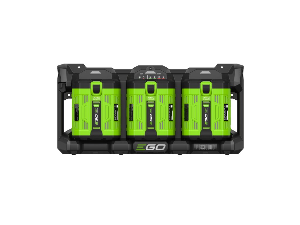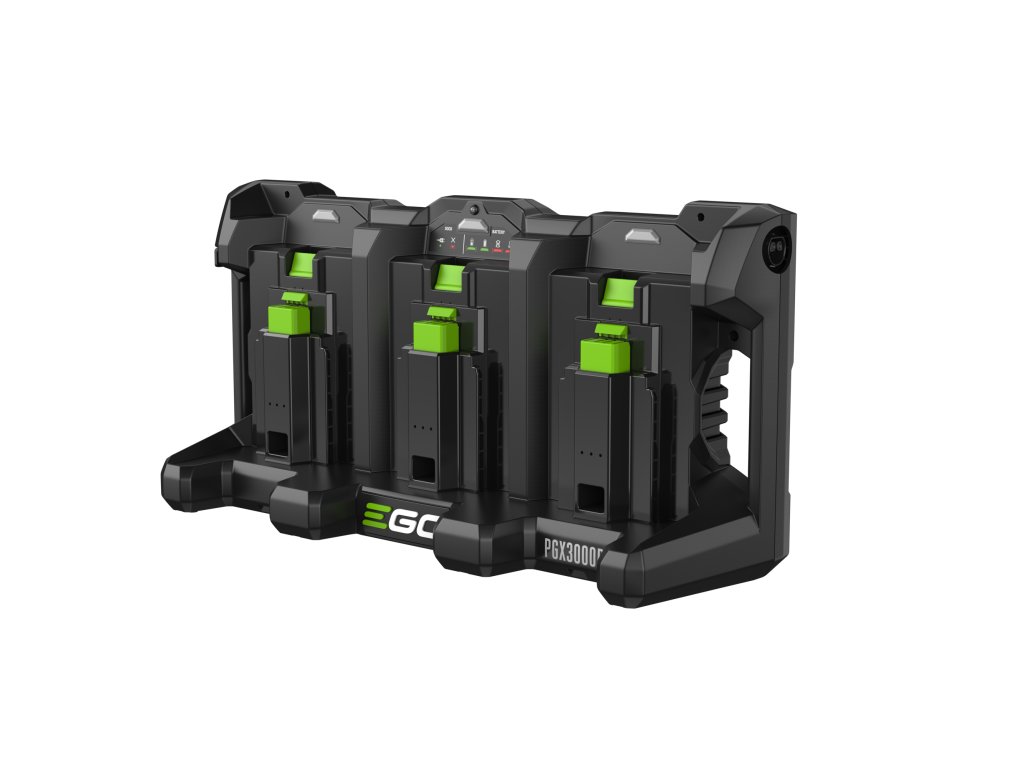 Nabíjecí adaptér PGX300D je k nabíječce připojen nabíjecím kabelem a konektorem se zámkem. 3-místných nabíjecích adaptérů PGX3000D může být připojeno do série za sebou několik a lze tak nabíjet i několik desítek baterií najednou. Nabíječka je opatřena řídící elektronikou, která naprosto samostatně vyhodnotí stav baterií a automaticky zvolí režim nabíjení, dobu nabíjení a nabíjecí proud. Stav baterie a aktuální stav nabití je indikován LED diodami na každé z nich. Takže firma, využívající celou flotilu více strojů EGO, tak např. přes noc nabije současně celý počet baterií, které pokryjí výkon potřebný pro celodenní práci všech strojů.